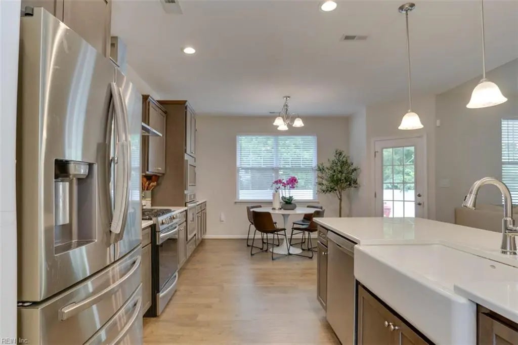 The VA assumable at 4% and a recent price reduction take center stage, making this beautifully upgraded ranch with 3 beds and 2.5 baths on the main level (plus two more bedrooms and a full bath upstairs) an exceptional opportunity. The flexible layout features a formal dining room off the open-concept kitchen and family room with vaulted ceiling, custom built-ins, and a stone fireplace. Gourmet kitchen includes quartz counters, shaker cabinets, a gas range, wall oven, built-in microwave, tile backsplash, and under-cabinet lighting. Primary suite offers a soaking tub, tile flooring, and tile shower. The garage includes an electric car charger. Central Chesapeake/Suffolk border location provides convenient access to major highways and regional military bases.
